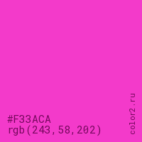 Цвет #F33ACA в цветовой модели RGB обозначается тремя октетами (243, 58, 202) в десятичном формате и #F33ACA в шестнадцатиричном (hex) формате, которые являются интенсивностью красного 243 (hex F3), интенсивность зелёного 58 (hex 3A) и интенсивность синего 202 (hex CA).