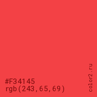 Цвет #F34145 в цветовой модели RGB обозначается тремя октетами (243, 65, 69) в десятичном формате и #F34145 в шестнадцатиричном (hex) формате, которые являются интенсивностью красного 243 (hex F3), интенсивность зелёного 65 (hex 41) и интенсивность синего 69 (hex 45).