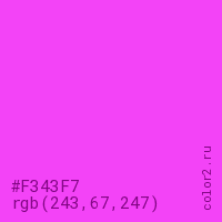 Цвет #F343F7 в цветовой модели RGB обозначается тремя октетами (243, 67, 247) в десятичном формате и #F343F7 в шестнадцатиричном (hex) формате, которые являются интенсивностью красного 243 (hex F3), интенсивность зелёного 67 (hex 43) и интенсивность синего 247 (hex F7).