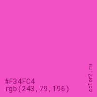Цвет #F34FC4 в цветовой модели RGB обозначается тремя октетами (243, 79, 196) в десятичном формате и #F34FC4 в шестнадцатиричном (hex) формате, которые являются интенсивностью красного 243 (hex F3), интенсивность зелёного 79 (hex 4F) и интенсивность синего 196 (hex C4).