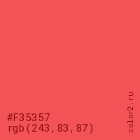 Цвет #F35357 в цветовой модели RGB обозначается тремя октетами (243, 83, 87) в десятичном формате и #F35357 в шестнадцатиричном (hex) формате, которые являются интенсивностью красного 243 (hex F3), интенсивность зелёного 83 (hex 53) и интенсивность синего 87 (hex 57).