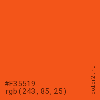 Цвет #F35519 в цветовой модели RGB обозначается тремя октетами (243, 85, 25) в десятичном формате и #F35519 в шестнадцатиричном (hex) формате, которые являются интенсивностью красного 243 (hex F3), интенсивность зелёного 85 (hex 55) и интенсивность синего 25 (hex 19).