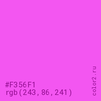 Цвет #F356F1 в цветовой модели RGB обозначается тремя октетами (243, 86, 241) в десятичном формате и #F356F1 в шестнадцатиричном (hex) формате, которые являются интенсивностью красного 243 (hex F3), интенсивность зелёного 86 (hex 56) и интенсивность синего 241 (hex F1).