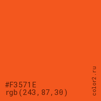 Цвет #F3571E в цветовой модели RGB обозначается тремя октетами (243, 87, 30) в десятичном формате и #F3571E в шестнадцатиричном (hex) формате, которые являются интенсивностью красного 243 (hex F3), интенсивность зелёного 87 (hex 57) и интенсивность синего 30 (hex 1E).
