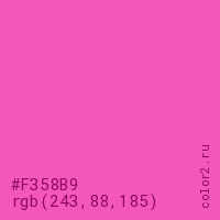 Цвет #F358B9 в цветовой модели RGB обозначается тремя октетами (243, 88, 185) в десятичном формате и #F358B9 в шестнадцатиричном (hex) формате, которые являются интенсивностью красного 243 (hex F3), интенсивность зелёного 88 (hex 58) и интенсивность синего 185 (hex B9).