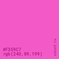 Цвет #F359C7 в цветовой модели RGB обозначается тремя октетами (243, 89, 199) в десятичном формате и #F359C7 в шестнадцатиричном (hex) формате, которые являются интенсивностью красного 243 (hex F3), интенсивность зелёного 89 (hex 59) и интенсивность синего 199 (hex C7).