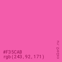 Цвет #F35CAB в цветовой модели RGB обозначается тремя октетами (243, 92, 171) в десятичном формате и #F35CAB в шестнадцатиричном (hex) формате, которые являются интенсивностью красного 243 (hex F3), интенсивность зелёного 92 (hex 5C) и интенсивность синего 171 (hex AB).
