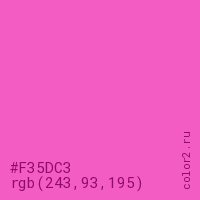 Цвет #F35DC3 в цветовой модели RGB обозначается тремя октетами (243, 93, 195) в десятичном формате и #F35DC3 в шестнадцатиричном (hex) формате, которые являются интенсивностью красного 243 (hex F3), интенсивность зелёного 93 (hex 5D) и интенсивность синего 195 (hex C3).