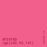 Цвет #F35F8D в цветовой модели RGB обозначается тремя октетами (243, 95, 141) в десятичном формате и #F35F8D в шестнадцатиричном (hex) формате, которые являются интенсивностью красного 243 (hex F3), интенсивность зелёного 95 (hex 5F) и интенсивность синего 141 (hex 8D).
