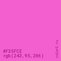 Цвет #F35FCE в цветовой модели RGB обозначается тремя октетами (243, 95, 206) в десятичном формате и #F35FCE в шестнадцатиричном (hex) формате, которые являются интенсивностью красного 243 (hex F3), интенсивность зелёного 95 (hex 5F) и интенсивность синего 206 (hex CE).