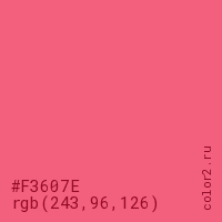 Цвет #F3607E в цветовой модели RGB обозначается тремя октетами (243, 96, 126) в десятичном формате и #F3607E в шестнадцатиричном (hex) формате, которые являются интенсивностью красного 243 (hex F3), интенсивность зелёного 96 (hex 60) и интенсивность синего 126 (hex 7E).