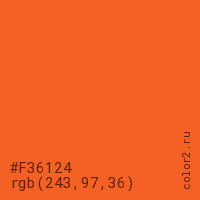 Цвет #F36124 в цветовой модели RGB обозначается тремя октетами (243, 97, 36) в десятичном формате и #F36124 в шестнадцатиричном (hex) формате, которые являются интенсивностью красного 243 (hex F3), интенсивность зелёного 97 (hex 61) и интенсивность синего 36 (hex 24).