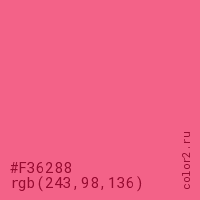 Цвет #F36288 в цветовой модели RGB обозначается тремя октетами (243, 98, 136) в десятичном формате и #F36288 в шестнадцатиричном (hex) формате, которые являются интенсивностью красного 243 (hex F3), интенсивность зелёного 98 (hex 62) и интенсивность синего 136 (hex 88).