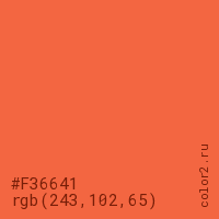 Цвет #F36641 в цветовой модели RGB обозначается тремя октетами (243, 102, 65) в десятичном формате и #F36641 в шестнадцатиричном (hex) формате, которые являются интенсивностью красного 243 (hex F3), интенсивность зелёного 102 (hex 66) и интенсивность синего 65 (hex 41).