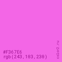 Цвет #F367E6 в цветовой модели RGB обозначается тремя октетами (243, 103, 230) в десятичном формате и #F367E6 в шестнадцатиричном (hex) формате, которые являются интенсивностью красного 243 (hex F3), интенсивность зелёного 103 (hex 67) и интенсивность синего 230 (hex E6).