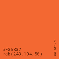 Цвет #F36832 в цветовой модели RGB обозначается тремя октетами (243, 104, 50) в десятичном формате и #F36832 в шестнадцатиричном (hex) формате, которые являются интенсивностью красного 243 (hex F3), интенсивность зелёного 104 (hex 68) и интенсивность синего 50 (hex 32).