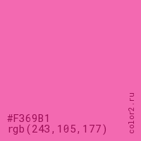 Цвет #F369B1 в цветовой модели RGB обозначается тремя октетами (243, 105, 177) в десятичном формате и #F369B1 в шестнадцатиричном (hex) формате, которые являются интенсивностью красного 243 (hex F3), интенсивность зелёного 105 (hex 69) и интенсивность синего 177 (hex B1).