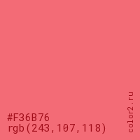 Цвет #F36B76 в цветовой модели RGB обозначается тремя октетами (243, 107, 118) в десятичном формате и #F36B76 в шестнадцатиричном (hex) формате, которые являются интенсивностью красного 243 (hex F3), интенсивность зелёного 107 (hex 6B) и интенсивность синего 118 (hex 76).
