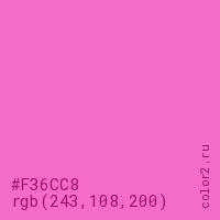 Цвет #F36CC8 в цветовой модели RGB обозначается тремя октетами (243, 108, 200) в десятичном формате и #F36CC8 в шестнадцатиричном (hex) формате, которые являются интенсивностью красного 243 (hex F3), интенсивность зелёного 108 (hex 6C) и интенсивность синего 200 (hex C8).