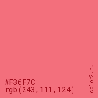 Цвет #F36F7C в цветовой модели RGB обозначается тремя октетами (243, 111, 124) в десятичном формате и #F36F7C в шестнадцатиричном (hex) формате, которые являются интенсивностью красного 243 (hex F3), интенсивность зелёного 111 (hex 6F) и интенсивность синего 124 (hex 7C).