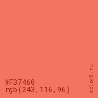 Цвет #F37460 в цветовой модели RGB обозначается тремя октетами (243, 116, 96) в десятичном формате и #F37460 в шестнадцатиричном (hex) формате, которые являются интенсивностью красного 243 (hex F3), интенсивность зелёного 116 (hex 74) и интенсивность синего 96 (hex 60).
