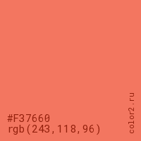 Цвет #F37660 в цветовой модели RGB обозначается тремя октетами (243, 118, 96) в десятичном формате и #F37660 в шестнадцатиричном (hex) формате, которые являются интенсивностью красного 243 (hex F3), интенсивность зелёного 118 (hex 76) и интенсивность синего 96 (hex 60).