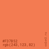 Цвет #F37B52 в цветовой модели RGB обозначается тремя октетами (243, 123, 82) в десятичном формате и #F37B52 в шестнадцатиричном (hex) формате, которые являются интенсивностью красного 243 (hex F3), интенсивность зелёного 123 (hex 7B) и интенсивность синего 82 (hex 52).