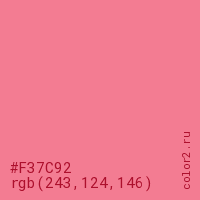 Цвет #F37C92 в цветовой модели RGB обозначается тремя октетами (243, 124, 146) в десятичном формате и #F37C92 в шестнадцатиричном (hex) формате, которые являются интенсивностью красного 243 (hex F3), интенсивность зелёного 124 (hex 7C) и интенсивность синего 146 (hex 92).