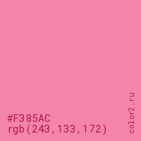 Цвет #F385AC в цветовой модели RGB обозначается тремя октетами (243, 133, 172) в десятичном формате и #F385AC в шестнадцатиричном (hex) формате, которые являются интенсивностью красного 243 (hex F3), интенсивность зелёного 133 (hex 85) и интенсивность синего 172 (hex AC).