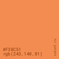 Цвет #F38C51 в цветовой модели RGB обозначается тремя октетами (243, 140, 81) в десятичном формате и #F38C51 в шестнадцатиричном (hex) формате, которые являются интенсивностью красного 243 (hex F3), интенсивность зелёного 140 (hex 8C) и интенсивность синего 81 (hex 51).