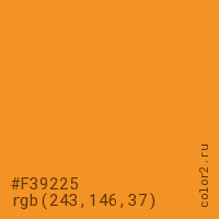 Цвет #F39225 в цветовой модели RGB обозначается тремя октетами (243, 146, 37) в десятичном формате и #F39225 в шестнадцатиричном (hex) формате, которые являются интенсивностью красного 243 (hex F3), интенсивность зелёного 146 (hex 92) и интенсивность синего 37 (hex 25).