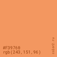 Цвет #F39760 в цветовой модели RGB обозначается тремя октетами (243, 151, 96) в десятичном формате и #F39760 в шестнадцатиричном (hex) формате, которые являются интенсивностью красного 243 (hex F3), интенсивность зелёного 151 (hex 97) и интенсивность синего 96 (hex 60).