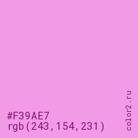 Цвет #F39AE7 в цветовой модели RGB обозначается тремя октетами (243, 154, 231) в десятичном формате и #F39AE7 в шестнадцатиричном (hex) формате, которые являются интенсивностью красного 243 (hex F3), интенсивность зелёного 154 (hex 9A) и интенсивность синего 231 (hex E7).