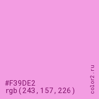 Цвет #F39DE2 в цветовой модели RGB обозначается тремя октетами (243, 157, 226) в десятичном формате и #F39DE2 в шестнадцатиричном (hex) формате, которые являются интенсивностью красного 243 (hex F3), интенсивность зелёного 157 (hex 9D) и интенсивность синего 226 (hex E2).