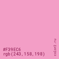 Цвет #F39EC6 в цветовой модели RGB обозначается тремя октетами (243, 158, 198) в десятичном формате и #F39EC6 в шестнадцатиричном (hex) формате, которые являются интенсивностью красного 243 (hex F3), интенсивность зелёного 158 (hex 9E) и интенсивность синего 198 (hex C6).