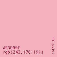 Цвет #F3B0BF в цветовой модели RGB обозначается тремя октетами (243, 176, 191) в десятичном формате и #F3B0BF в шестнадцатиричном (hex) формате, которые являются интенсивностью красного 243 (hex F3), интенсивность зелёного 176 (hex B0) и интенсивность синего 191 (hex BF).