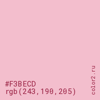 Цвет #F3BECD в цветовой модели RGB обозначается тремя октетами (243, 190, 205) в десятичном формате и #F3BECD в шестнадцатиричном (hex) формате, которые являются интенсивностью красного 243 (hex F3), интенсивность зелёного 190 (hex BE) и интенсивность синего 205 (hex CD).