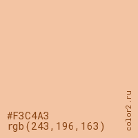Цвет #F3C4A3 в цветовой модели RGB обозначается тремя октетами (243, 196, 163) в десятичном формате и #F3C4A3 в шестнадцатиричном (hex) формате, которые являются интенсивностью красного 243 (hex F3), интенсивность зелёного 196 (hex C4) и интенсивность синего 163 (hex A3).