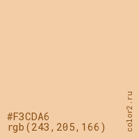 Цвет #F3CDA6 в цветовой модели RGB обозначается тремя октетами (243, 205, 166) в десятичном формате и #F3CDA6 в шестнадцатиричном (hex) формате, которые являются интенсивностью красного 243 (hex F3), интенсивность зелёного 205 (hex CD) и интенсивность синего 166 (hex A6).