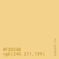 Цвет #F3D38B в цветовой модели RGB обозначается тремя октетами (243, 211, 139) в десятичном формате и #F3D38B в шестнадцатиричном (hex) формате, которые являются интенсивностью красного 243 (hex F3), интенсивность зелёного 211 (hex D3) и интенсивность синего 139 (hex 8B).