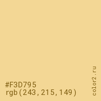 Цвет #F3D795 в цветовой модели RGB обозначается тремя октетами (243, 215, 149) в десятичном формате и #F3D795 в шестнадцатиричном (hex) формате, которые являются интенсивностью красного 243 (hex F3), интенсивность зелёного 215 (hex D7) и интенсивность синего 149 (hex 95).