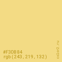 Цвет #F3DB84 в цветовой модели RGB обозначается тремя октетами (243, 219, 132) в десятичном формате и #F3DB84 в шестнадцатиричном (hex) формате, которые являются интенсивностью красного 243 (hex F3), интенсивность зелёного 219 (hex DB) и интенсивность синего 132 (hex 84).