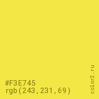 Цвет #F3E745 в цветовой модели RGB обозначается тремя октетами (243, 231, 69) в десятичном формате и #F3E745 в шестнадцатиричном (hex) формате, которые являются интенсивностью красного 243 (hex F3), интенсивность зелёного 231 (hex E7) и интенсивность синего 69 (hex 45).