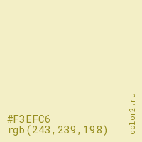 Цвет #F3EFC6 в цветовой модели RGB обозначается тремя октетами (243, 239, 198) в десятичном формате и #F3EFC6 в шестнадцатиричном (hex) формате, которые являются интенсивностью красного 243 (hex F3), интенсивность зелёного 239 (hex EF) и интенсивность синего 198 (hex C6).