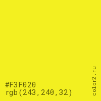 Цвет #F3F020 в цветовой модели RGB обозначается тремя октетами (243, 240, 32) в десятичном формате и #F3F020 в шестнадцатиричном (hex) формате, которые являются интенсивностью красного 243 (hex F3), интенсивность зелёного 240 (hex F0) и интенсивность синего 32 (hex 20).