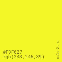 Цвет #F3F627 в цветовой модели RGB обозначается тремя октетами (243, 246, 39) в десятичном формате и #F3F627 в шестнадцатиричном (hex) формате, которые являются интенсивностью красного 243 (hex F3), интенсивность зелёного 246 (hex F6) и интенсивность синего 39 (hex 27).