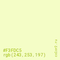 Цвет #F3FDC5 в цветовой модели RGB обозначается тремя октетами (243, 253, 197) в десятичном формате и #F3FDC5 в шестнадцатиричном (hex) формате, которые являются интенсивностью красного 243 (hex F3), интенсивность зелёного 253 (hex FD) и интенсивность синего 197 (hex C5).