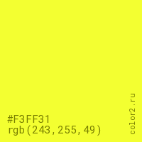 Цвет #F3FF31 в цветовой модели RGB обозначается тремя октетами (243, 255, 49) в десятичном формате и #F3FF31 в шестнадцатиричном (hex) формате, которые являются интенсивностью красного 243 (hex F3), интенсивность зелёного 255 (hex FF) и интенсивность синего 49 (hex 31).