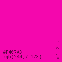 Цвет #F407AD в цветовой модели RGB обозначается тремя октетами (244, 7, 173) в десятичном формате и #F407AD в шестнадцатиричном (hex) формате, которые являются интенсивностью красного 244 (hex F4), интенсивность зелёного 7 (hex 07) и интенсивность синего 173 (hex AD).