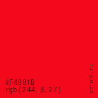 Цвет #F4081B в цветовой модели RGB обозначается тремя октетами (244, 8, 27) в десятичном формате и #F4081B в шестнадцатиричном (hex) формате, которые являются интенсивностью красного 244 (hex F4), интенсивность зелёного 8 (hex 08) и интенсивность синего 27 (hex 1B).